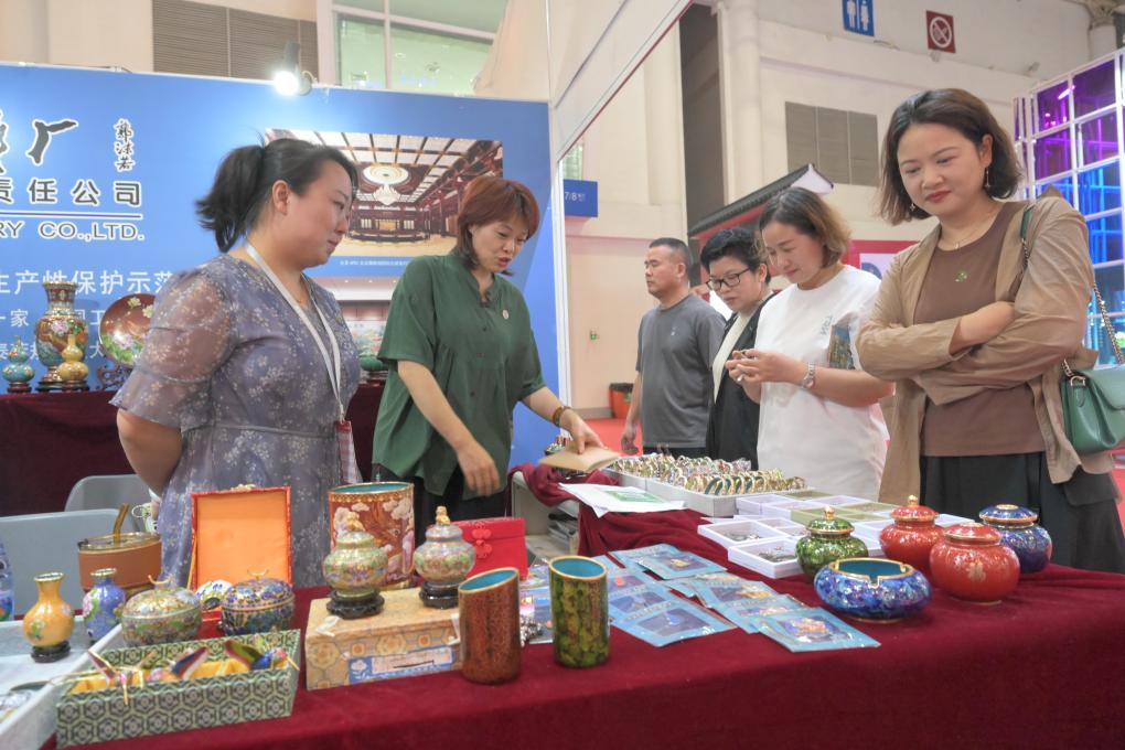 5月10日,观众在博览会现场参观景泰蓝工艺品。